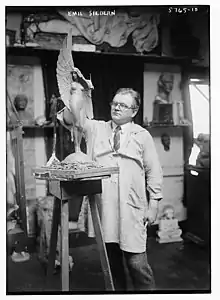 Siebern, a tall and heavy man,[6] worked in various styles, but he was particularly adept at Art Deco and a pioneer in stainless steel as an art medium, as exemplified in this polished steel nymph with beach ball at New York's Astoria Park swimming pool in Queens.[7][8] He is best known for his figurative sculptures as well as his relief panels at public buildings in New York,[9] Detroit,[10] Montreal[11] and elsewhere. He also made the statues of King William III and Queen Mary II originally intended for the entrance to the College of William and Mary at the end of Duke of Gloucester Street in Williamsburg, Virginia, but eventually placed in 1932 on the gate piers to the college at James Blair Drive and Richmond Road, the King and Queen Gate.[12][13]