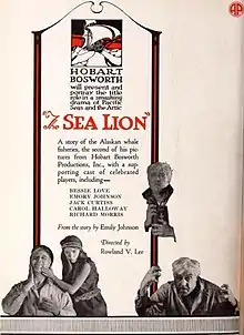 That same year, Hobart Bosworth Productions picked up another Emilie Johnson project, The Sea Lion. This tale of adventure, romance, and intrigue occurred aboard a whaling vessel. The movie version was released in December 1921. The Sea Lion starred Hobart Bosworth, Bessie Love, and Emory Johnson.[16]