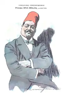Emin was son of Zahiyya Shihāb and Mağīd Arslān, son of Milḥam, son of Ḥaidar, son of 'Abbās, son of Fakhreddīn.[2][3] He had three brothers: Nouhad, Fouad, Sa'īd and Tawfīq (also transliterated as Toufic). The latter helped found Greater Lebanon in 1920 and fathered Mağīd Arslān II (1908–1983), a Lebanon's independence hero, member of the Lebanese Parliament and government minister. Current traditional chief of the Arslān family, Talal Arslan, is therefore a great nephew of Emin Arslan.