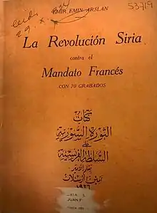 In June 1926, Arslan founded Al-Istiklal (الإستقلال), The Independence. The magazine was in Arabic but part of its commercial ads were in Spanish. It came into being as a political and intellectual response to the upheaval caused by the Great Syrian Revolt,[41] and was one of the main Arabic anti-French organs from Argentina/Brazil. Moreover, it represented a particular strand within local pan-Arab/nationalist anti-colonial thought and activism.[42]