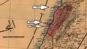 Mount Lebanon Mutasarrifate, 1893. Arrows mark Tripoli, Beirut and Arslan's birthplace, Choueifat.