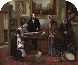 Brownlow created four paintings in the same format depicting scenes from Foundling Hospital life and are permanently displayed at The Foundling Museum. The first oil painting, dated from 1858, is titled The Foundling Returned to its Mother and is the most prominent painting of the four, depicting a mother of a foundling receiving her child back into custody. Her next painting was done in 1863, The Christening, followed by The Sick Room (1864), an oil on canvas painting depicting a romanticized version of a child being cared for in the Foundling Hospital. The fourth painting is titled Taking Leave (1868) and shows the process of a foundling preparing to begin work. The paintings are noted not only for their representation of the Foundling Hospital, but for their inclusion of reproductions of famous paintings in the Hospital's collection; including two major works by William Hogarth and one by Benjamin West. Catherine Roach notes that Brownlow's reproductions of Old Master paintings "stage a drama of redemption" for Foundling children using submerged representations of glorious causes.[4] Rachel Bowlby argues that these paintings "carried on her father's work, promoting the virtues and values of the institution through pictures of its daily life and rituals."[5] Brownlow also painted smaller works depicting foundling children as well as portraits.