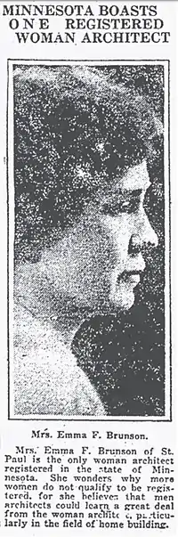 - 1 2 Troute-Oertel, Diane (Fall 2007). "Emma F. Brunson: The first woman registered as an architect in Minnesota" (PDF). Ramsey County History. Vol. 52, no. 3. Ramsey County Historical Society. p. 15. ISSN 0485-9758. Archived (PDF) from the original on 15 July 2021.