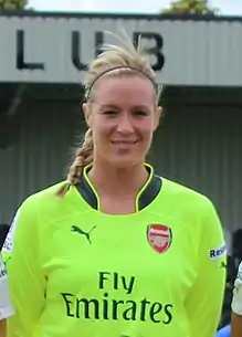 Byrne was given a free transfer by Arsenal in December 2016 on the expiry of her contract, after being supplanted in the team by Sari van Veenendaal.[10] With Arsenal, Byrne won eleven league titles, ten FA Women's Cups, five FA Women's Premier League Cups, two FA Women's League Cups and the UEFA Women's Champions League once. She holds the record number of appearances for Arsenal with 459.[11]