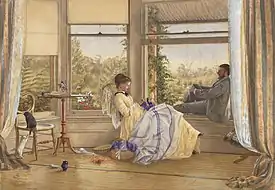 Her work Interior with figures, The Grange 1875 shows her talent for watercolour. Painted when she was just sixteen it is a snapshot of Australian life. The large bay window is shaded by galvanised iron typical of Australian homes of the period. The interior is relaxed, with the window opened. A young Man sits on the window ledge not quite inside or outside the room, his companion, a young woman is seated inside, sewing. There is a relaxed atmosphere with the messy sewing box and two cats playing by a chair to the left of the painting. The spatial relationship of the kittens imitates that of the man and the woman. It comments on the relaxed atmosphere and social obligations that were a part of colonial society in Australia. Even during Victorian times social standards and decorum was not as strict as it was in Britain.[7]