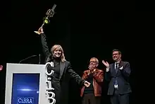 Suárez holding her Alice Guy film award at the closing gala of the 2023 CiBRA Festival.