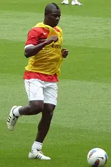 Frimpong made his Premier League debut for Arsenal in their match against Newcastle United on 13 August 2011, coming on as a second-half substitute for Tomáš Rosický.[15] On 16 August 2011, Frimpong came on as a second-half substitute for Rosický again, this time in the UEFA Champions League match against Udinese.[16] He made his first start in the Premier League on 20 August 2011 against Liverpool, but ended up being sent off in the 69th minute of the match after receiving a second yellow card for a challenge on Lucas.[17] Following Arsenal's loss to Manchester City in the League Cup quarter-finals, Frimpong and then-teammate Samir Nasri clashed in the tunnel. They had tussled throughout the tie and at the end of the match they appeared to start arguing as the teams walked off the pitch, before continuing their disagreement in the tunnel.[18] Following the incident, Nasri and Frimpong were not disciplined over the incident.[19]
