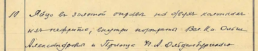On the second page of this document, as number 10, there is a description "Egg with gold mounts, on two nephrite columns, with portraits of Gr. Dss. Olga Alexandrovna and Duke P.A. Oldenburg inside". This description is the most accurate that Fabergé researchers have to date concerning the egg of 1902, which was previously mistaken for an "Egg from nephrite, on a gold base and with portrait of the Emperor Alexander III in a medallion".[7]
