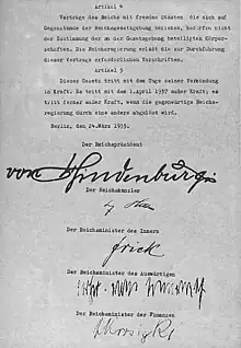 Once the Enabling Act was introduced, it was hastily passed by the Reichstag and Reichsrat on 23 March 1933.[13][14][15] Later that day, the Enabling Act was signed into law by President Paul von Hindenburg.[16] Unless extended by the Reichstag, the act would expire after four years. With the Enabling Act now in force, the cabinet (in practice, the chancellor) could pass and enforce laws without any objection. The combined effect of the Enabling Act and the Reichstag Fire Decree transformed Hitler's government into a legal dictatorship and laid the groundwork for his totalitarian regime. By July, the NSDAP was the only legally permitted party in Germany. The Reichstag from 1933 onward effectively became the rubber stamp parliament that Hitler had desired.[17] The Enabling Act was renewed twice, but was rendered moot when Nazi Germany surrendered to the Allies in 1945, and repealed by a law passed by the occupying powers in September of that year.