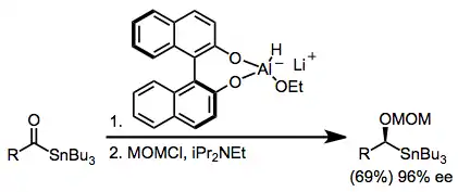 Lithium aluminium hydride (LAH) modified with chiral alkoxide ligands has been shown to proceed in good yield and high enantioselectivity. Chelating ligands such as BINOL[6] are used to avoid disproportionation and background reduction by LAH. Chiral diamines and amino alcohols have also been used to modify LAH for enantioselective reductions.