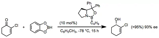 With borane or catecholborane as the stoichiometric reducing agent, chiral oxazaborolidine catalysts may be used to reduce ketones enantioselectively. Catecholborane may be used as an alternative to solutions of borane-Lewis base adducts.[10]