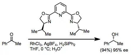 Hydrosilylation may be used to reduce ketones after silyl ether hydrolysis. Rhodium(I) and rhodium(III) salts are the most common catalysts for hydrosilylation. Asymmetric induction may be conferred by chiral PYBOX ligands.[16]