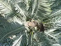 This cycad grows up to two metres tall with a trunk diameter of up to forty five centimetres and may be branched or unbranched. The leaves are up to one hundred and fifty centimetres long, blue or silver and strongly keeled. The leaflets are lanceolate, do not overlap each other and have smooth margins. The male cones are green or brown and up to thirty five centimetres long. The female cones are a similar colour and up to fifty centimetres long. The seeds are red and up to four and a half centimetres long.[3]