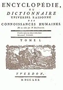 The Encyclopedia of Yverdon (in French: Encyclopédie, ou Dictionnaire universel raisonné des connaissances humaines) is an encyclopedia compiled by Fortunato Bartolomeo de Félice and published in 58 volumes from 1770 through 1780 in Yverdon-les-Baines, Switzerland. The Encyclopedia of Yverdon is not as culturally French nor as philosophically skeptical of religion as the work it is based upon, the Encyclopédie of Diderot and d'Alembert. Due to these differences, the Encyclopedia of Yverdon was known as the Protestant encyclopedia and was widely distributed across Northern Europe.