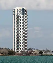 The building was built in 2008 on the shore of Clear Lake, originally envisioned to be the first of a number of high-rise residential buildings that would be built on the waterfront of the generally low-rise suburban area near the Johnson Space Center.[1] However, damage from Hurricane Ike in late 2008, combined with the property-market downturn of the 2008 financial crisis, led to the developer filing for bankruptcy in May 2009, having sold only 36 of the 80 units.[2] The remaining 44 units were purchased in bankruptcy court in December 2009 by an investment partnership, for $9.5 million plus past-due taxes.[3][4] The new owners repaired and renovated the building at a cost of $2 million, and relaunched condominium sales in 2010.[5]