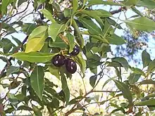 The fruit is an egg shaped drupe. Black and shiny, 2 to 3.5 cm long. The single seed is ovate and pointed 25 to 30 mm long. Fruit eaten by rainforest birds including the white-headed pigeon and topknot pigeon. Fruit ripe from March to October.