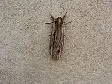 The wingspan is about 70 mm. Adults have a streaky speckled fawn pattern on their wings. The abdomen is banded in brown and grey.[2]