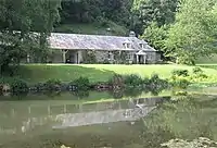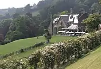 The landscaping was designed by Humphry Repton and the grounds originally comprised a plantation of 300 acres, including a thickly wooded slope going down to the river, and gardens of 20 acres. The buildings in the grounds include the Shell Grotto, a polygonal summer-house and the Swiss Cottage, restored by the Landmark Trust with a thatched roof. Also, the Dairy Dell, by Repton, Pond Cottages by a pool and the octagonal Dairy surrounded by a loggia, and the Holy Well, part of which is an ancient structure formerly situated at Leigh Barton, and used as the baptismal font of the hunting seat of the Abbots of Tavistock Abbey.[8] The following structures as well as the main house are Grade I listed: Rockery and Grotto, Stables, Salmon Larder and Ice House, Shell House and Grotto.