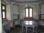 Hussey described it as "the outstanding and probably most nearly perfect surviving instance of a romantic cottage orné, devised for an aristocratic owner under the influence of the taste for the picturesque".[7] The site was chosen by the Duchess, as a plaque in the stables records. It consists of a main range with two swept-back wings on either side. The roofline displays several chimney stacks in the Elizabethan style and dormer windows. The east wing was principally a service range, whilst the west wing is in the form of a pavilion known as the "Children's Cottage" linked by a rustic colonnade to the central block.