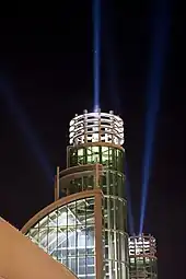 The entire southern frontage is a long hall, linking the exhibit spaces with various offices. Most of the southern wall of the hall is glass, providing light to the entrances to the exhibit halls which have no windows. At the eastern end of the hall is a small open exhibition space, sometimes used as an art gallery, used by the CNE for cat and dog shows. At the eastern end of the hall is a "living wall." Under the main exhibit space is an underground parking garage, providing 1,300 spaces,[8] which is connected to the Beanfield Centre in the Automotive Building to the south by a tunnel. Along the top of the hall at towers above entrances are four rotating spotlights which are illuminated when shows are being held at the centre. The external southern frontage differs along its length. The eastern section mimics the building style of the Automotive Building, using masonry and columns, while the western section is steel and glass, described as "flamboyant futurism".[10]