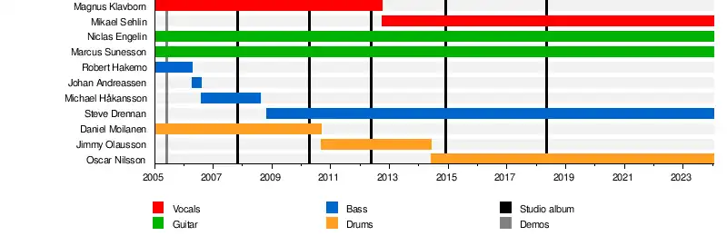 On 18 April 2006, Robert Hakemo was replaced by Johan Andreassen.[4] On 5 August 2006, Michael Håkansson became the new bass player.[5] On 14 August 2008, Håkansson left the band to pursue other opportunities. Steve Drennan (Amon Amarth) took over playing bass during November 2008. During 2010, the band replaced their drummer Daniel "Mojjo" Moilanen with Jimmy Olausson, who also plays drums for Marionette. In June 2014, Olausson quit the band and was replaced with Oscar Nilsson.[6]