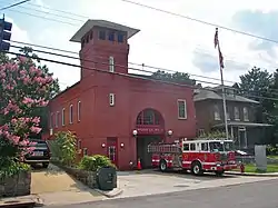 Engine Company No. 17 also known as Chemical Company No. 4 and the Brookland Firehouse, is a historic firehouse located at 1227 Monroe Street, NE, Washington, D.C.[2] It was constructed in 1902 and housed an early “chemical company” which fought fires in outlying districts using large soda-acid extinguishers rather than using steam pumpers on the unreliable municipal water supply. The firehouse was innovative at the time of its construction, having a built-in electrical system, and it was designed to make use of the new call box system installed in the neighborhood. It was officially designated Engine Company 17 in 1905.