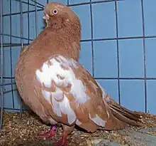The English Short-faced Tumbler[2] is a breed of fancy pigeon developed over many years of selective breeding.[3] English Short-faced Tumblers along with other varieties of domesticated pigeons are all descendants of the rock dove (Columba livia). The English Short-faced Tumbler is one of the oldest breeds referred to in John Moore's book [4] Columbarium: or, The pigeon-house; being an introduction to a natural history of tame pigeons, giving an account of the several species known in England, with the method of breeding them, their distempers and cures (London: J. Wilford, 1735).[5]