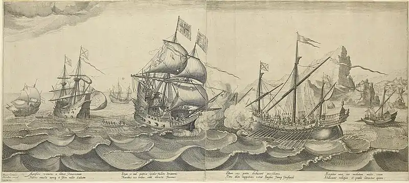 The galleon's next major battle took place during December 1601 in the Irish harbor of Castlehaven where an entire Spanish expedition sent to support the rebellion in Ireland was destroyed in the Battle of Castlehaven. In June 1602 she was off the coast of Spain again and began an attack on Cezimbra Bay near Lisbon (Portugal) which resulted at the Battle of Sesimbra Bay in the capture of a large carrack loaded with treasure valued at a million ducats.