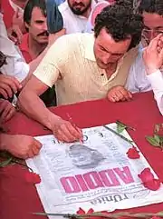 In 1981, Berlinguer said that, in his personal opinion, the progressive force of the October Revolution had been exhausted.[65] The PCI criticised the martial law in Poland and soon the PCI's split with the CPSU became definitive and official, followed by a long polemic between Pravda and l'Unità (the official newspaper of PCI), not made any milder after an October meeting with Cuban leader Fidel Castro in Havana;[66][67][68] the PCI joked that they succeeded where the CIA failed when Berlinguer closed the hand of Castro's security chief in the door of a GAZ Chaika who let out a single stoic moan (l'Unità's Havana correspondent recalled that "a sinister noise of broken bones" was heard) before being hospitalised but the episode did not spoil Berlinguer's visit.[69] Nonetheless, his last years were marked by attempts for unity among the national and international political left.[41] He also continued to underline the necessary link between democracy and socialism, which was followed by a strong commitment on the issues of nuclear disarmament and détente.[70]