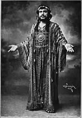 Caruso's voice extended up to high D-flat in its prime and grew in power and weight as he grew older. At times, his voice took on a dark, almost baritonal colouration.[50] He sang a broad spectrum of roles, ranging from lyric, to spinto, to dramatic parts, in the Italian and French repertoires. In the German repertoire, Caruso sang only two roles, Assad (in Karl Goldmark's The Queen of Sheba) and Richard Wagner's Lohengrin, both of which he performed in Italian in Buenos Aires in 1899 and 1901, respectively.[51]