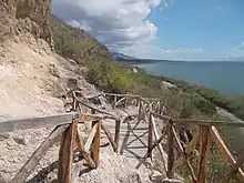 Lake Enriquillo is located within a linear depression that formed as a ramp basin between the Haiti fold and thrust belt to the north and the uplifted oceanic crust of the Massif de la Selle and Sierra de Bahoruco mountain ranges to the south.[9] The Enriquillo-Plantain Garden fault is a later strike-slip fault, cutting across the depression, which extends from Jamaica in the west to near Neiba in the Dominican Republic in the east.[lower-alpha 2] The valley, a former marine strait, was created around one million years ago when the water level fell and the strait was filled in by sediments of the Yaque del Sur River.[10] Due to this, tremors in the region are common.