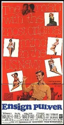 Ensign Pulver is a 1964 American Technicolor film in Panavision and a sequel to the 1955 film Mister Roberts. The film stars Robert Walker Jr., Burl Ives, Walter Matthau and Tommy Sands and features Millie Perkins, Larry Hagman, Kay Medford, Peter Marshall, Jack Nicholson, Richard Gautier, George Lindsey, James Farentino and James Coco.[2]