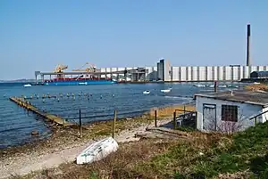 The power station had two units, which went in service in 1969 and 1977. The older unit, which was in 1997 transformed in a combined gas- and steam-turbine plant, has a total height from 127.7 metres (419 ft) with its chimney on the roof. The chimney of the other unit is 180.7 metres (593 ft) tall. Coal is delivered to the power station by ship. The harbour of the power plant is with a depth of 18 metres (59 ft) the deepest of Denmark.