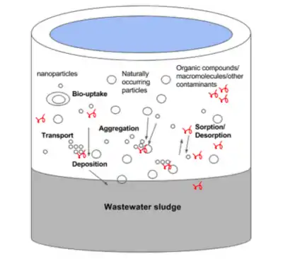 A majority of the submerged portions of wastewater treatment plants are anoxic and rich in sulfur.[6] During the wastewater treatment process, silver nanoparticles either remain the same, are converted into free silver ions, complex with ligands, or agglomerate.[7] Silver nanoparticles can also attach to wastewater biosolids found in both the sludge and the effluent.[7] Silver ions in wastewater are removed efficiently because of their strong complexation with chloride or sulfide.[8]