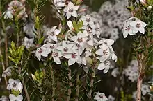Epacris barbata, commonly known as bearded heath,[2] is a species of flowering plant in the heath family Ericaceae and is endemic to a restricted area of Tasmania. It is an erect shrub with lance-shaped leaves and white, tube-shaped flowers with hairy sepals.