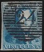 Epaulettes (French: Épaulettes, Dutch: Epauletten)[lower-alpha 1] is the name given by philatelists to the first series of postage stamps issued by Belgium. The stamps, which depicted King Leopold I with prominent epaulettes from which the name derives, became legally usable on 1 July 1849. Two denominations with the same design were issued simultaneously: a brown 10 centimes and a blue 20 centimes. They were produced as the result of a series of national reforms to the postal system in Belgium, based on the success of similar British measures adopted in 1840. The stamps allowed postal costs to be pre-paid by the sender, rather than the receiver, and led to a sharp increase in the volume of mail. Although quickly superseded by new types, Epaulettes proved influential and have since inspired several series of commemorative stamps.