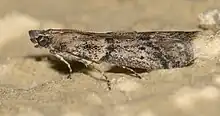 The wingspan is 12–16 mm. Adults are light grayish-tan with irregular bands of brown scales across the middle of the forewings and near the apex.