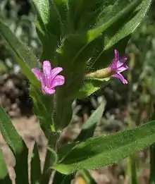 Epilobium densiflorum is a species of willowherb known by the common names denseflower willowherb, dense spike-primrose or dense boisduvalia. It is native to western North America from British Columbia to Baja California, where it is found in a variety of habitats. This is an erect annual often exceeding a meter in height with fuzzy green foliage. The pointed leaves are up to 8 centimeters long near the base of the plant, and the upper leaves are generally more hairy than the lower. The stem may branch or not. The top of the stem is occupied by a hairy, leafy, densely flowered inflorescence. Each flower has four deeply notched petals in shades of pinkish purple to nearly white with dark veining, each about a centimeter long. The fruit is a cylindrical capsule about a centimeter long.
