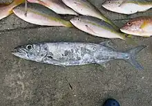 The domine (Epinnula magistralis) is a tropical species of snake mackerel found in all oceans at depths of from 100 to 185 metres (328 to 607 ft).[2] This species can reach a length of 100 centimetres (39 in) SL though most do not exceed 45 centimetres (18 in) SL. While not specifically targeted, this fish is edible and is eaten when caught.