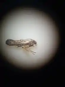 The wingspan is 10โ11 mm. The forewings are whitish densely irrorated (sprinkled) with black, appearing grey. There is a suffused blackish spot in the disc before the middle, another on the anal angle, and a third less apparent towards the apex. The hindwings are grey.