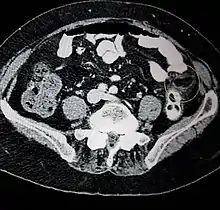 Omental infarction: Omental infarction is uncommon reason for acute abdomen. It is similar to acute appendicitis. The pain is of a few days duration centering in the right lower or upper quadrant. Imaging is required to obtain an accurate diagnosis due to the common misdiagnosis of omental infarction as appendicitis or cholecystitis. Omental infarction occurs commonly in pediatric patients approximately 15 percent of cases. The most frequent cause of non- torsion related omental infarction is due to trauma as well as thrombosis or the omental veins. The predisposition for omental infarction includes obesity, strenuous activity, congestive heart failure, digitalis administration, recent abdominal surgery and trauma.[2] "The typical CT findings are a solitary large non-enhancing omental mass with heterogeneous attenuation, which is most often located in the right lower quadrant, deep to the rectus abdominis muscle and either anterior to the transverse colon or anteromedial to the ascending colon".[2] Omental Infarction can be difficult to differentiate from diverticulitis however omental infarction is not normally attributed with bowel wall thickening. It is rare that the colonic wall will be thickened due to spread of the inflammation from the omentum (a fold of peritoneum connecting or supporting abdominal structures) to the tenia omentalis of the colon.[2]