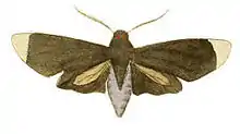 Upperside: Antennae black. Head and thorax black. On the neck are two small scarlet spots just above the eyes, and one on each side below them. Abdomen silvery shining blue, having a triangular black mark at the base. Anterior wings dirty black, immaculate; tips whitish. Posterior wings dirty black, with a white discoidal transparent cloud.