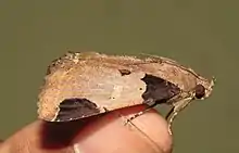 Its head, thorax and forewings are pale reddish brown. The collar and patagia are often streaked with black. Forewings with indistinct, waved antemedial line and a very much excurved postmedial line beyond the cell. A waved sub-marginal line is present. Orbicular is a speck and reniform is indistinctly dark outlined. Abdomen and hindwings fuscous black. Hindwings with three medial white spots, which may be disconnected and the costal spot obsolescent or conjoined into a band. A spot near center of outer margin. Cilia white at apex and outer angle. Ventral side ochreous white, irrorated (sprinkled) with black. Forewings with oblique crenulate postmedial line and broad sub-marginal diffused band. Hindwings similar, but with a lunule at end of cell and the line more irregular. Colours and spots can vary in subspecies.[3]