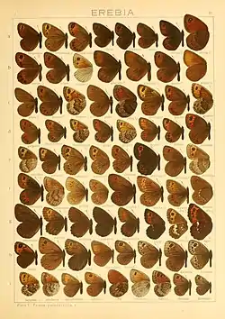 Erebia ottomana H.-Schaff. (37 i) is the largest of all the tyndarus forms. Besides the two subapical ocelli the band of the forewing has further back 2 additional small ocelli which are either feebly centred with white or are quite blind. Hindwing beneath uniformly grey. From the Balcan Peninsula, Greece and Armenia, being lately often sold as balcanica .[2]