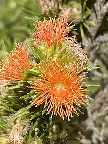 The flowers are usually orange, rarely dark pink and are on the ends of short side branches off the previous year's wood. The flowers occur singly, rarely two together. There are 5 sepals which are hairy on the outside surface and 5 petals 3–4 millimetres (0.1–0.2 in) long. The stamens are arranged in 5 bundles, each containing 28 to 34 stamens. Flowering occurs from August to November and is followed by fruits which are woody capsules. The capsules are 3.5–6 millimetres (0.1–0.2 in) long, shaped like an inverted cone and are rough or lumpy on the outer surface.[3]
