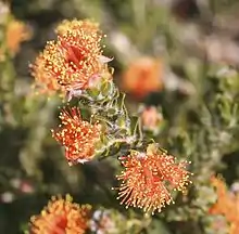 The flowers are orange-coloured and arranged in groups of up to six on the ends of the branches of the previous year's growth. There are 5 sepals and 5 petals 3.5–5.7 millimetres (0.1–0.2 in) long. The stamens, which give the flower its colour, are arranged in 5 bundles, each containing 34 to 48 stamens. Flowering occurs from September to December and is followed by fruits which are woody capsules. The capsules are more or less barrel-shaped, smooth and 8–11 millimetres (0.3–0.4 in) long and 2.8–6.1 millimetres (0.1–0.2 in) wide.[2]