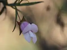 The flowers are borne singly in leaf axils on an s-shaped, flattened stalk which is 15–27 mm (0.6–1 in) long. There are 5 linear, green to purple sepals differing slightly in length, 10–15.5 mm (0.4–0.6 in) long and lance-shaped. The petals are 20–40 mm (0.8–2 in) long and joined at their lower end to form a tube. The petal tube is white, pink, mauve or purple. The outside of the tube and petal lobes are hairy while the inner surface of the lobes is glabrous and the inside of the tube is filled with woolly hairs. The lowest petal lobe covers the opening of the petal tube. Flowering occurs from March to October and is followed by fruits which are dry, woody oval to cone-shaped and 5.5–9 mm (0.2–0.4 in) long.[2][3][4]