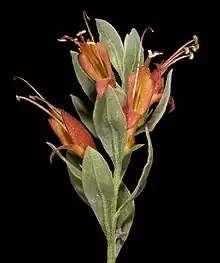 The flowers are red or orange, sometimes yellow and occur singly in the leaf axils on flower stalks 4.5–7 millimetres (0.2–0.3 in) long. There are 5 partly overlapping sepals which are narrow triangular to egg shaped and 5 petals forming a tube except at the ends where the lowest lobe is thinner that the rest and is turned back below the flower. Flowering occurs from January to November and is followed by fruits which are oval to almost spherical and 6.6–9 millimetres (0.3–0.4 in) in diameter.[1][4][2][3]