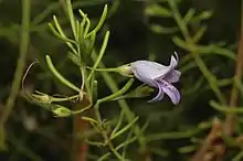 The flowers are borne singly or in pairs on a glabrous, sticky stalk usually 4–10 mm (0.2–0.4 in) long. There are 5 green, tinged reddish-brown sepals which are linear to narrow-triangular in shape, mostly 2.5–4 mm (0.1–0.2 in) long and hairy on the inner surface only. The petals are 15–28 mm (0.6–1 in) long and are joined at their lower end to form a tube. The flower buds are brown but when it opens the petal tube is pale lilac-coloured to violet on the outside and white to pale lilac inside. The outside surface of the petal tube is glabrous and often shiny but the middle part of the lower petal lobe and the inside of the petal tube are covered with matted hairs. The 4 stamens are fully enclosed in the petal tube. Flowering occurs from late September to February and is followed by hairy, woody, oval-shaped or cone-shaped fruits with a pointed end. The fruits are about 5 mm (0.2 in) long.[2][3]