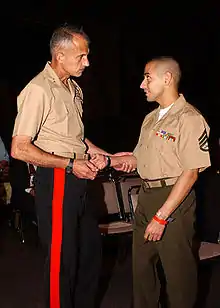 Major General Christopher Cortez (left), commends Staff Sergeant Eric Alva on July 13, 2003, calling him "a credit to the Corps".[1]